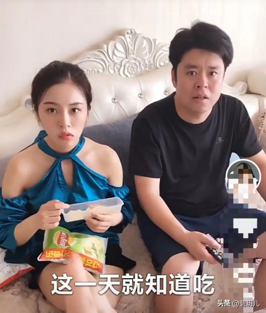 祝晓晗和老爸坐在沙发上,一个吃着零食,一个在看电视,老妈突然走过来,指着老爸说“你瞅瞅你闺女,整天就知道吃,倒贴钱都没人要。”