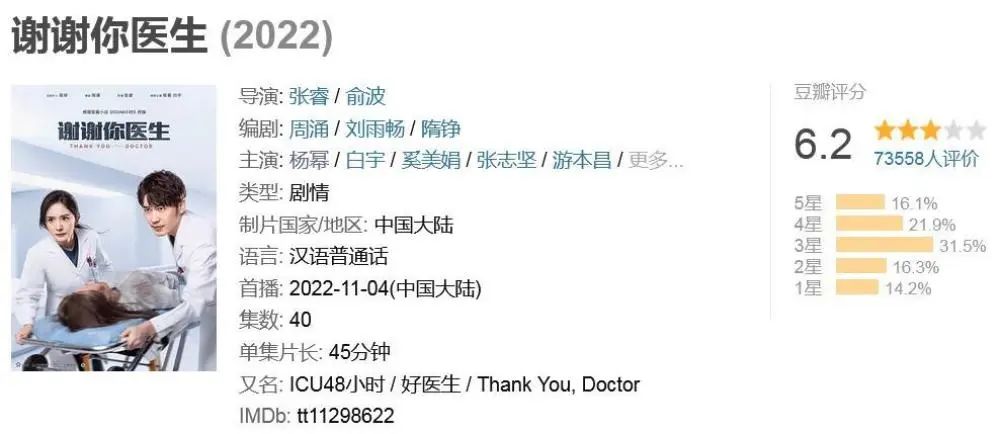 先是职场剧《谢谢你医生》,杨幂的台词太差了,尤其是大段的医学术语,基本是毫无感情地背诵,加上本身就有点夹子音,越发显得生硬。