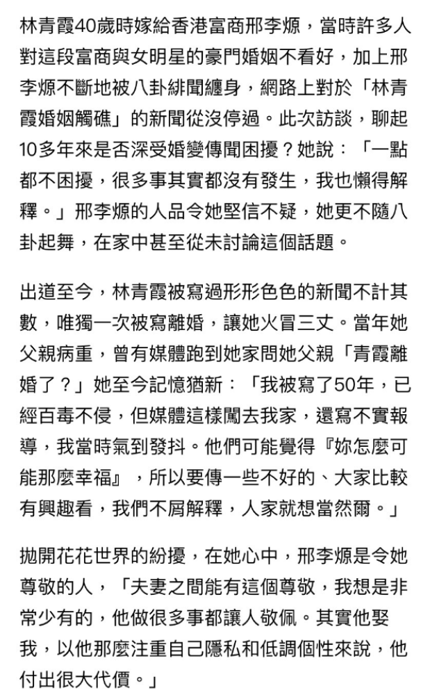 而在此次采访中,林青霞也透露她与邢李源的感情始终没有受到外界舆论的困扰,很多事根本没有发生,而她自己也懒得解释,而她一直坚信邢李源的品行与为人,两人在家中也从未讨论过外界疯传的八卦话题。
