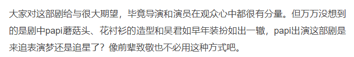 中戏导演系毕业的她,在2017年出演了吴君如执导的喜剧影片《妖铃铃》,不过荧幕首秀并为带来太大惊喜,当时这部电影评分也只有4.2分,甚至有直接表达对她的失望。“papi出演这部剧是来追表演梦还是追星了?像前辈致敬也不必用这种方式吧。”