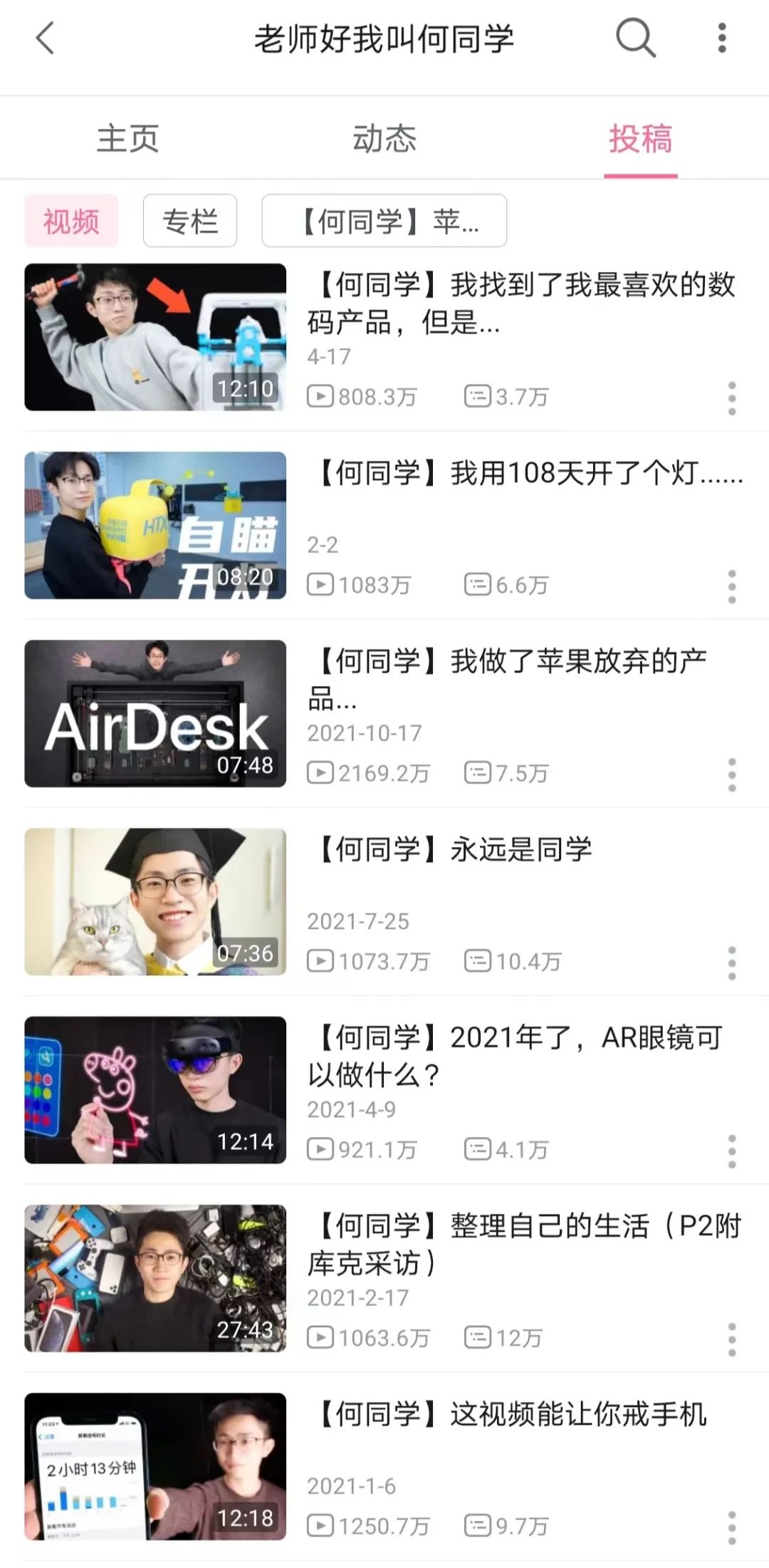 以何同学为例,自2019年6月凭借一条名为《有多快?5G在日常使用中的真实体验》的视频一夜走红后,之后创作的每条视频几乎都能登上平台热门。