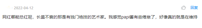 追溯至更早的2019年,那时就已经就用户评论papi酱“江郎才尽”,更新的数量和质量都有所下降。据统计,2019年papi酱一共更新33条视频,也是从2019年开始,papi酱的视频在微博播放量开始跌破1000万。随着网络红人增多,papi酱的美貌和才华似乎进入了低落期,不再是唯一。