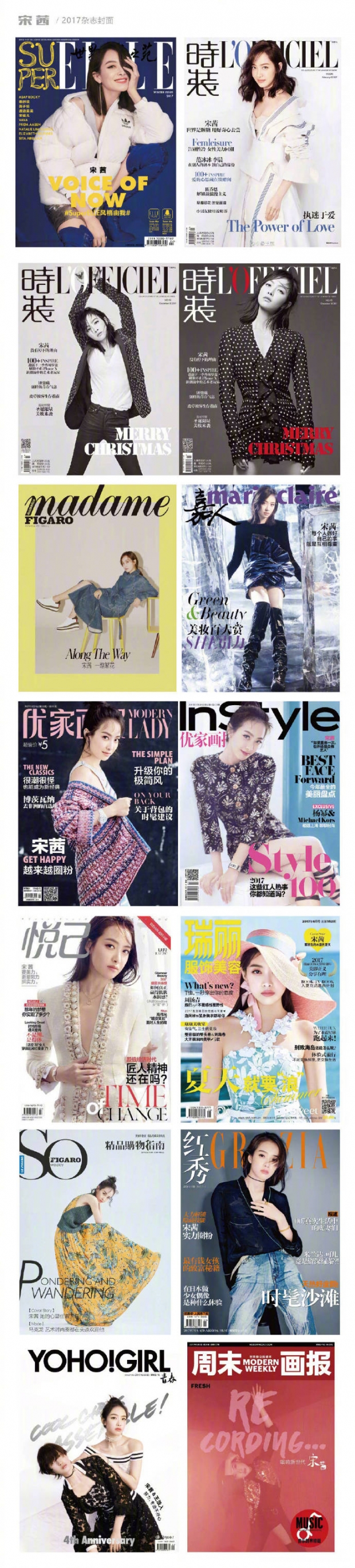 2017年,宋茜封面大片数量质量均佳,首登《嘉人》, 更是年内二登《时装LOFFICIEL》和《InStyle优家画报》。